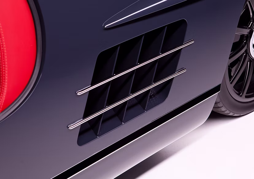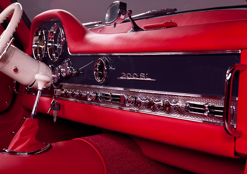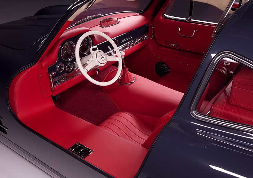 The exterior modifications were carefully executed to preserve the timeless design of the Gullwing while subtly modernizing its functionality and refinement. Custom-machined headlight rings by Jessie Greening enhance the front lighting assemblies, paired with H4 conversion headlights for improved visibility. Exterior trim was handcrafted to closely resemble the original factory appearance, maintaining authenticity while elevating fit and finish through modern craftsmanship.