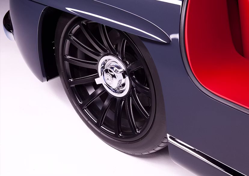 The Gullwing rides on one-off EVOD monoblock wheels measuring 19x13 inches in the front and 18x8 inches in the rear, creating a bold yet balanced stance. Michelin Pilot Super Sport tires sized 235/30R18 in the front and 345/30R19 in the rear provide modern grip and performance while complementing the vehicle’s upgraded chassis and braking systems.